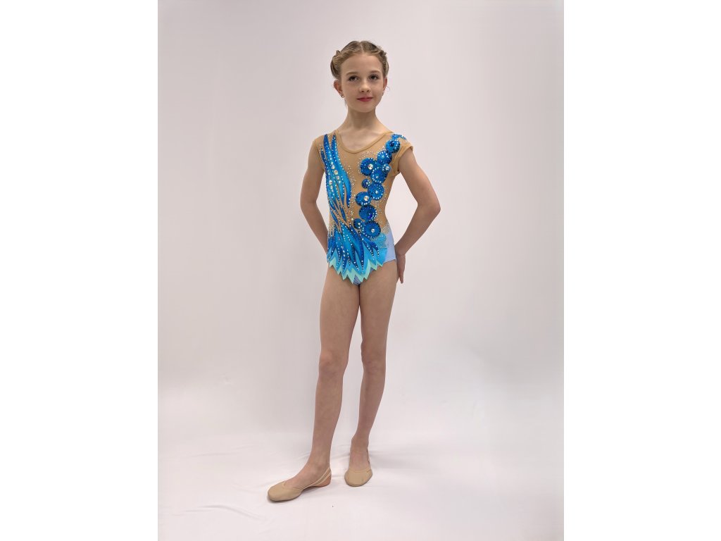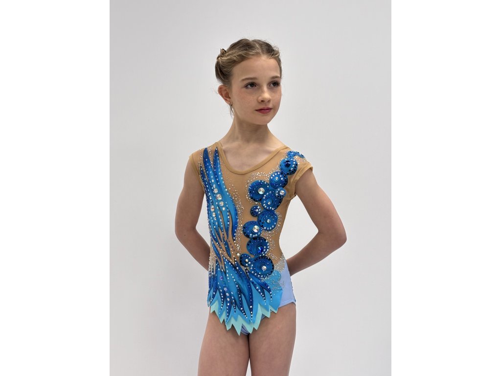 Kombinácia žiarivých modrých tónov ručne maľovaných, jemného telového tylu a dozdobené kamienkami vytvára dojem pohybu, elegancie a ľahkosti. Dres pôsobí luxusne a profesionálne – presne tak, ako má pôsobiť súťažná gymnastka.