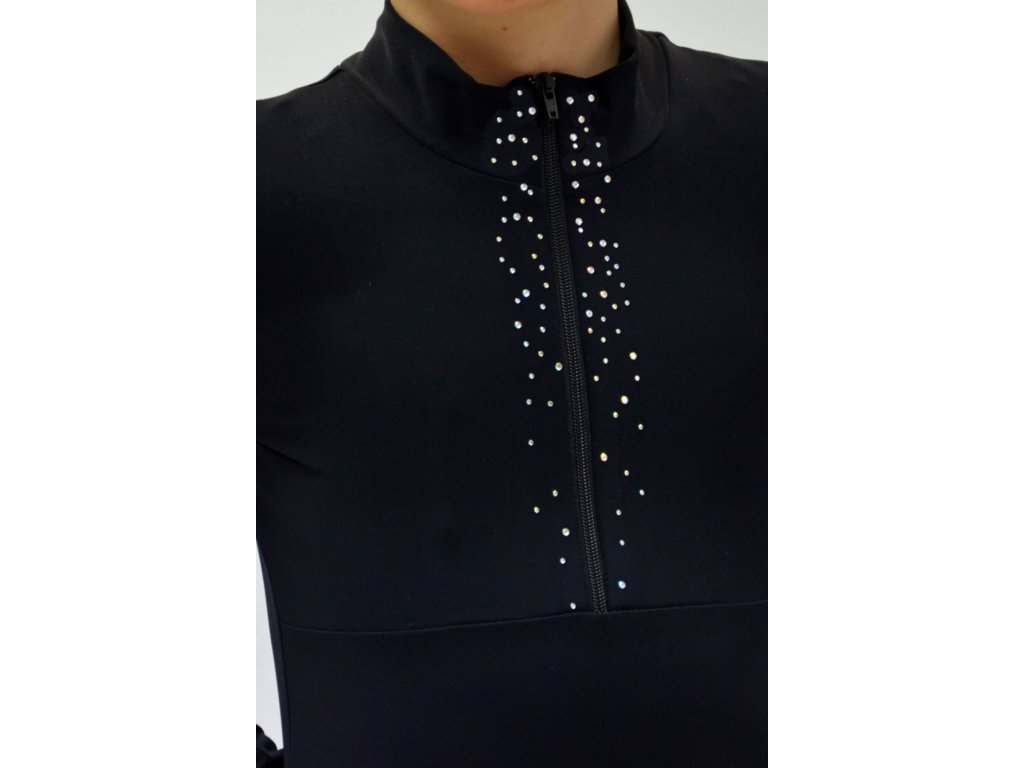 Stojačik a zips: Tričko je navrhnuté so stojačikom ku krku a zipsom, ktorý umožňuje nastavenie podľa potreby – či už pre pohodlie počas tréningov alebo funkčnosť pri regulácií tepla. Zdobenie kamienkami: Okolo zipsu je umiestnené jemné zdobenie kamienkami, ktoré pridáva tričku extra šmrnc a lesk. Tento detail zvyšuje eleganciu a je ideálny pre športové a tanečné vystúpenia.